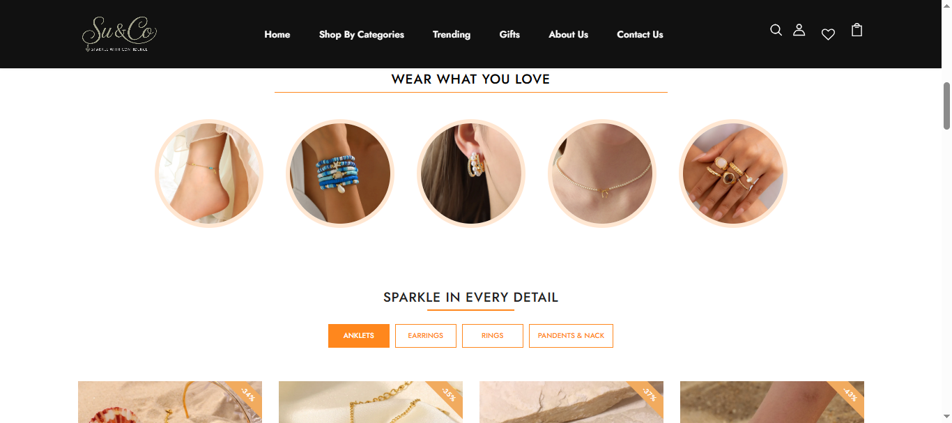 SU & CO Jewelry presents a curated collection of refined jewelry—featuring 18K gold-plated, Brazilian gold, moissanite, and sterling silver pieces. Their catalog includes anklets, earrings, rings, bracelets, pendants, and necklaces, all styled to offer modern elegance for every occasion.